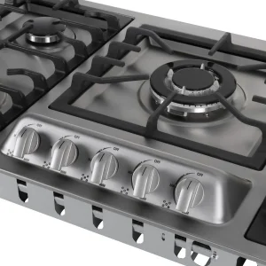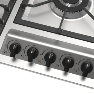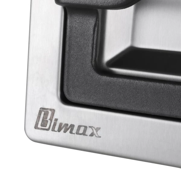 اجاق گاز صفحه ای بیمکث مدل 5099 با بدنه استیل 304 کوهاندار، پنج شعله و شعله پلوپز وسط، طراحی مقاوم و شیک مناسب پخت حرفه‌ای.