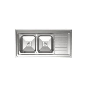 سینک روکار کن مدل 9102 با ابعاد 120×60 سانتی‌متر و عمق لگن 21 سانتی‌متر، انتخابی ایده‌آل برای آشپزخانه‌های بزرگ و پرکار است. این مدل از ورق استیل ضد زنگ 304 با ضخامت 0.8 میلی‌متر ساخته شده و به دو فرم لگن چپ یا راست عرضه می‌شود. طراحی گوشه‌های لگن به صورت گرد (R10) و آب‌ریز مربعی، تخلیه آب را سریع و دقیق انجام می‌دهد و از نفوذ آب به کابینت جلوگیری می‌کند.